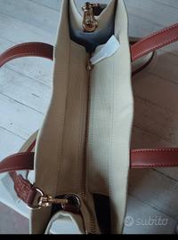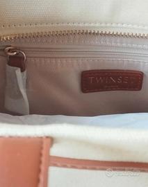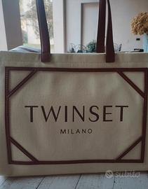 capiente borsa Twin Set in tela con manici in pelle , logo stampato sul davanti ,dettagli in pelle marroni, tracolla e manici , cerniera per chiudere la borsa e cerniera interna mis 30 x 38