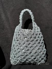 Borsa a rete in lucente cordino argento, corredata da sacchetto interno in tinta, chiuso da coulisse. Sarà l’accessorio passe-partout da abbinare ad un outfit casual o elegante. Disponibile anche in bluette con sacchetto grigio argento.