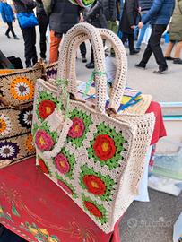 Borsa in cotone ricamato a mano, con interno in iuta con decorazioni a fiori in rlievo con manici. dimensioni 30x30x12cm spese spedizione a parte.
