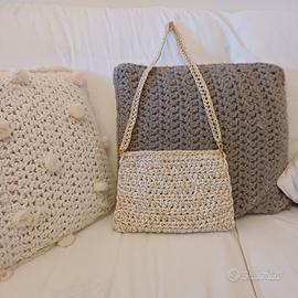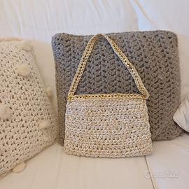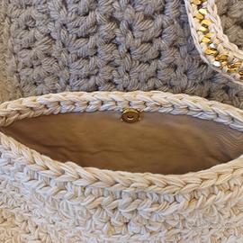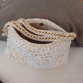 borsa uncinetto fatta a mano con filato di cotone panna e beige fodera interna con catenella dorata portabile a mano, a spalla o a tracolla