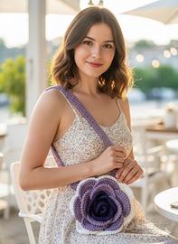 Borsa unica realizzata interamente a mano con t shirt yarn di alta qualità. Il design presenta una splendida rosa tridimensionale nei toni del lilla e viola, con base bianca per un contrasto elegante e delicato.