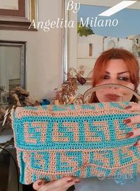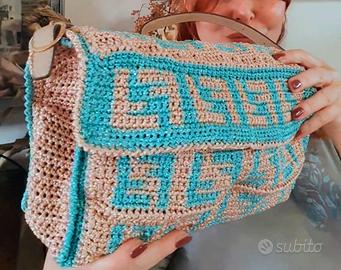 Stupenda borsetta modello con tracolla a spalla realizzata a crochet, ispirata ad Adele ed Edoardo. foderata interamente con seta e pizzo . Fantasia geometrica bicolore rosa cipria e tiffany.