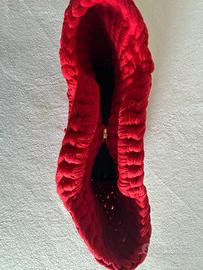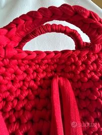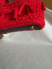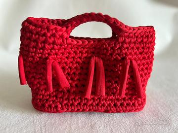 “Rosso Ribelle” è una borsa artigianale all’uncinetto, realizzata con filato spesso e corposo in un rosso acceso che non passa inosservato. La struttura compatta e solida è arricchita da dettagli decisi: nappine frontali che donano movimento e personalità, manici integrati per una presa comoda e sicura, e un fondo rigido con piedini in metallo dorato che proteggono e donano un tocco elegante.