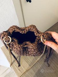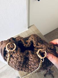 Borsa realizzata a mano con uncinetto, modello simile a Bottega veneta. Realizzata con fettuccia marrone completa di catenella.