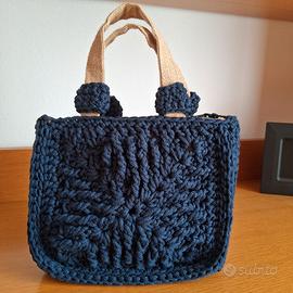 BORSA REALIZZATA A MANO A UNCINETTO, COTONE TESSILAND, 22x22cm, FODERATA INTERNAMENTE, UNCINETTO SU TUTTI LATI, COLORE BLU