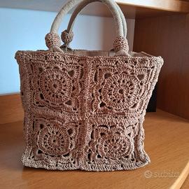 BORSA GRANNY REALIZZATA A MANO A UNCINETTO, 25x25cm, MANICI IN VIMINI, FODERATA INTERNAMENTE, DA PORTARE IN 2 MODI DIVERSI