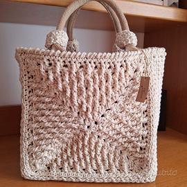 BORSA REALIZZATA A MANO A UNCINETTO, COTONE TESSILAND, 20x20cm, MANICO RESINA 47cm, FODERATA INTERNAMENTE, UNCINETTO SUL DAVANTI E SUL DIETRO MA NON LATERALE, COLORE PANNA