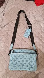 La borsa messenger Trio combina l'iconica tela Monogram e la pelle Taïga della Maison. L'accessorio presenta una tasca anteriore con zip e un portamonete agganciato tramite anello a D, entrambi amovibili, mentre l'interno è foderato in tessuto color nero. La tracolla, che si può rimuovere e regolare per indossare la creazione in diversi modi, è rifinita dalla firma Louis Vuitton.