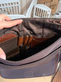 Borsa da uomo a tracolla in tessuto marrone con inserti in pelle. Ha molte tasche interne. Misure 35x33