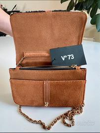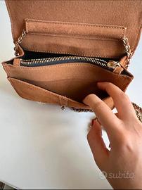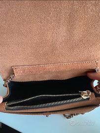 Base e patta in pelle scamosciata color cammello, catena dorata intrecciata con pelle per portarla a spalla o a tracolla.