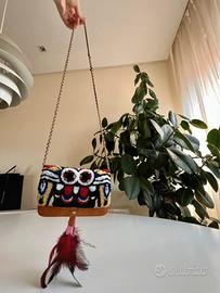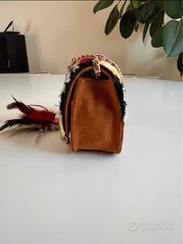 Borsa V°73 in tessuto effetto lana ricamata multicolor, con dettagli originali e piume decorative applicate sulla parte frontale.