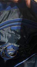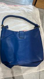 Borsa in pelle sintetica blu con texture martellata e dettagli dorati. Design elegante e strutturato, con chiusura frontale incisa, tracolla regolabile e interni capienti. Mai utilizzata, completa di dust bag originale. Un accessorio raffinato, perfetto per chi cerca stile italiano a un prezzo accessibile.