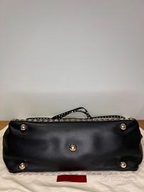 Presenta dettagli con borchie e parti metalliche in finitura platino, chiusura a gancio con ancora una parte delle pellicole originali (vedi foto), tracolla con borchie amovibile e piedini protettivi.