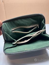 Borsa originale Valentino Guido – Roma, Italy – in vera pelle grigio scuro / blu scuro con cuciture a contrasto. Design compatto ma capiente, dotata di due scomparti principali con zip, taschina esterna e tracolla regolabile.