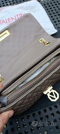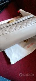 Vendo per inutilizzo Borsa Valentino Handbags – Modello Trapuntato con Catena Oro – Colore Tortora/Beige doppia lavorazione trapuntata (a chevron sulla parte superiore e a rombi sulla base).Chiusura a incastro con l'iconico logo dorato frontale.Interni: Ben organizzata, ideale per contenere , portafoglio e trucchi.Viene fornita con la sua dustbag originale.Usata una sola volta senza segni di usura evidenti.
