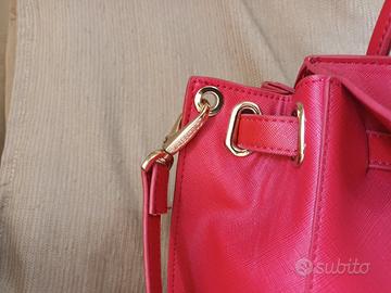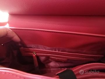 Vendo borsa Valentino rossa con dettagli dorati. È divisa in 3 scomparti con varie tasche, tra cui gli elastici per inserire le penne e quello centrale che si chiude con lo strappo è imbottito. Si può indossare sia a mano che a tracolla. Dimensioni circa 45x28x12