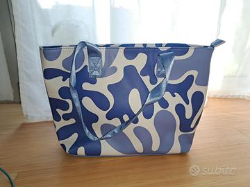 borsa a motivi, azzurra e bianca, larga circa 40cm, alta 30cm e profonda.