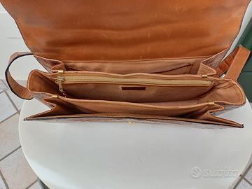 Borsa rigida di medie dimensioni con tracolla, anni '70, marchio Guido Borelli in vera pelle di coccodrillo con lo specchietto originale marchiato Guido Borelli. Il colore è molto bello con molte sfumature che virano al tabacco e cognac. Dimensioni: altezza cm 16, lunghezza cm 28, profondità sulla base cm 6, profondità sulla parte alta cm 5. Lunghezza tracolla cm 114. Aperta la patta la borsa è composta da 3 scomparti, uno centrale fisso con aggiunta di grande tasca con cerniera, due laterali realizzati a soffietto e su quello più interno è presente il taschino porta specchietto. Parti metalliche e pelle della borsa in perfette condizioni, come pure l'interno in pelle. La tracolla è danneggiata in 4 punti (vedi foto) riparabili con specifica colla professionale trasparente oppure accorciando la tracolla e portando la borsa a spalla.