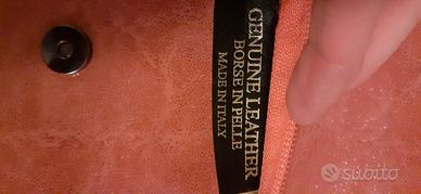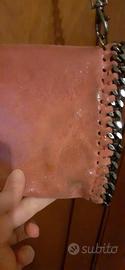 Borsa in vera pelle morbidissima. Colore salmone. Cm 21×14. Con catena su tutto il bordo. Tracolla catena rimovibile cm 115. Si puo' indossare a spalla, a tracolla o a mano rimuovendo la catena. Chiusura con cerniera e con bottone magnetico. Made in Italy. Acquistato da Il Laccio. Sul retro, in basso a destra ha un'ombra piu' scura, ultima foto.