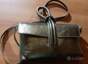 Borsa a tracolla verde brillante metallizzato. Cintura regolabile e removibile. Cinturino da polso e chiusura a nodo.