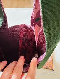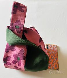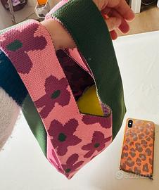 Borsa in maglia con design bicolore verde e rosa con grandi fiori.