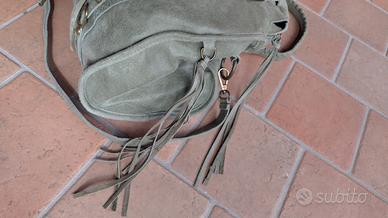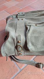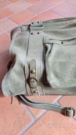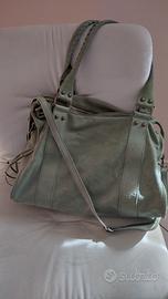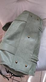 Borsa in vera pelle, colore verde chiaro, doppio manico e tracolla regolabile e removibile, taschina esterna con zip, chiusura centrale con cerniera, interno foderato, tasca interna con zip e altre tasche interne per fazzoletti e cellulare, inserti con frange in pelle e fibie, perfette condizioni