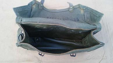 Borsa a vano unico con interno in pelle ed esterno in tessuto idrorepellente; finiture in cuoio verde. Adatta per vari impieghi anche per accessoriare moto Scrambler; è fornita di una cinghia regolabile e può essere trasformata in comodo zainetto. Materiale Militare originale.