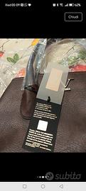 Borsa marrone con finitura martellata, Versace Italia. Il logo con la "V" e la corona, visibile sia sulla parte anteriore che sul ciondolo circolare, è distintivo della linea 19V69. Borsa caratterizzata da doppi manici e un pendente metallico decorativo con il logo del brand. Ecopelle con grana "dollaro" (martellata). Colore: Marrone scuro/testa di moro. Nuova,ancora imballato.
