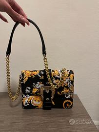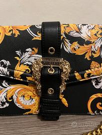 Borsa Versace Jeans Couture originale, nera con fibbia oro e disegni bianchi e gialli. Si può portare sia a spalla che a tracolla e la catena si può sganciare. Ottime condizioni usata pochissimo.