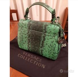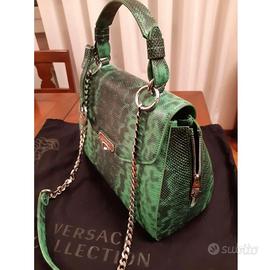 Borsa Versace Collection originale, pelle stampa serpente, colore verde/nera, chiusura logo dorato, 4 piedini dorati, 2 tasche interne di cui una con cerniera.