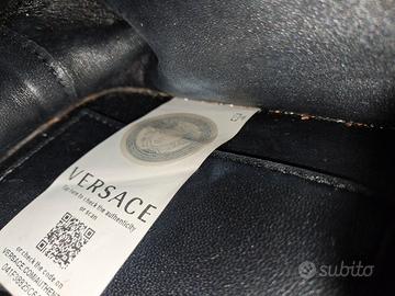 Vendo splendida borsa Versace modello "Virtus" in pelle con raffinata trama pitonata nei toni del beige, roccia e nero. Un pezzo iconico caratterizzato dall’inconfondibile hardware a forma di V barocca in metallo dorato.