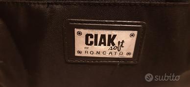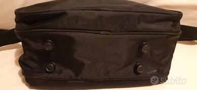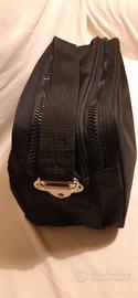 Borsa da viaggio Ciak Roncato nera in nylon con tracolla, due scomparti interni (chiusi da zip), due tasche esterne (chiuse da zip), e quattro piedini d'appoggio, in buone condizioni . Misure: 20/28/14 cm