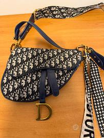 Borsa a spalla modello saddle in tela monogram blu con dettagli in pelle blu scuro e finiture dorate. Iconica chiusura con charm "D" frontale, completa di tracolla regolabile e intercambiabile. Capiente il giusto per l'essenziale, perfetta sia per il giorno che per la sera. Ottime condizioni.