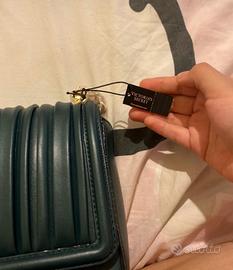 La borsa è in ottime condizione, nuova mai usata, è di colore verde scuro, ha le catene dorate, con etichetta e ancora rivolta di carta e "sacchetti", con