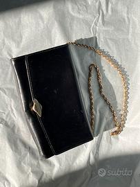 Borsa clutch vintage in pelle con tracolla a catena dorata intrecciata. Chiusura metallica a scatto. Interno in pelle con una tasca con cerniera. Borsa elegante da sera nel tipico design glamour degli anni 70. Fatta in Italia