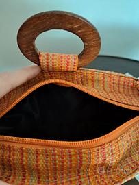 Borsa vintage arancione con trama colorata perfetta per la spiaggia con manici in legno. Forma a secchiello e rivestimento interno blu.