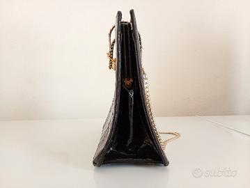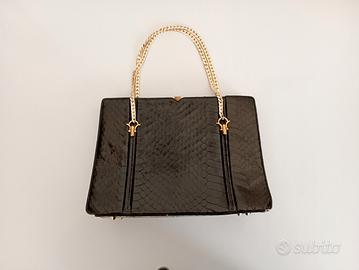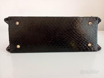 Splendido esemplare di artigianato d'eccellenza degli anni '60, questa borsa a mano (handbag) rappresenta il lusso intramontabile del "Mid-Century". Realizzata in vera pelle di rettile (pitone/anaconda) di un nero profondo e lucido, è un accessorio strutturato dal design trapezoidale, icona di eleganza classica. Il vero pezzo forte è lo stato di conservazione: l'interno in pura seta rossa è impeccabile, pulitissimo e rifinito con un taglio sartoriale dentellato (scalloped), dettaglio tipico della pelletteria di lusso dell'epoca. Dettagli Tecnici: Materiale esterno: Vera pelle di rettile lucida (non stampata). Interno: Fodera in seta rossa con tasca interna a zip e scomparti. Hardware: Chiusura a scatto e doppia catena piatta in metallo dorato lucido. Base: Fondo rigido con 4 piedini protettivi dorati. Misure precise (come da schizzo tecnico in foto): Altezza corpo borsa: 17,5 cm Altezza totale con manici: 32 cm Profondità alla base: 8,5 cm Condizioni: Oggetto vintage autentico in condizioni eccellenti. La pelle è elastica e brillante, la chiusura è perfetta e gli interni sono pari al nuovo. Nonostante non sia presente il marchio, la qualità dei materiali e la precisione delle cuciture testimoniano una manifattura di altissimo livello, superiore a molti prodotti industriali moderni. Prezzo: 95€ Spedizione: Disponibile con TuttoSubito (imballaggio accurato e protettivo) o consegna a mano in zona [TUA CITTÀ].