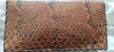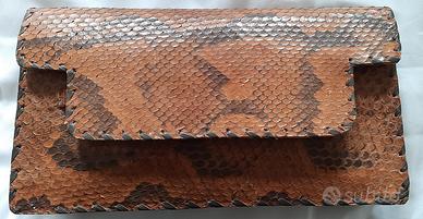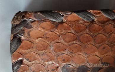 Borsa Vintage Anni '60 - Vera Pelle di Pitone - Origine Congo Descrizione: Rara borsa a mano artigianale risalente agli anni '60, acquistata in Congo. Un pezzo vintage autentico, ideale per collezionisti o amanti del genere etnico-chic. Caratteristiche Tecniche: Dimensioni: 29 cm (larghezza) x 15 cm (altezza) x 4,5 cm (profondità alla base). Materiale: Esterno in vera pelle di pitone con trama naturale e finiture perimetrali intrecciate a mano con stringhe di pelle scura. Sistema di Chiusura: Particolare meccanismo a incastro; la patta frontale si inserisce sotto la stringa di pelle orizzontale. Organizzazione Interna: Interno foderato in pelle chiara, suddiviso in più scomparti ampi. Presente una tasca centrale di sicurezza dotata di cerniera perfettamente funzionante. Modello: Borsa a mano (senza tracolla). Condizioni dell'oggetto: La borsa viene venduta nello stato in cui si trova, non restaurata e non lucidata, per preservarne la storia e l'originalità. Trattandosi di un oggetto vintage di oltre 60 anni, presenta segni del tempo e dell'uso (alcune squame sollevate e usura naturale sulle stringhe dell'intreccio), tutti chiaramente visibili nelle foto dettagliate allegate. Modalità di Vendita: Prezzo: 45€ Consegna: Esclusivamente ritiro a mano a Garlasco (PV). Non si effettua spedizione. Pagamento: Contanti al momento del ritiro.