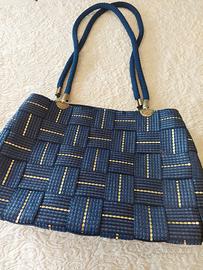 Borsa grande in tessuto blu navy e lurex made in Italy GM rande anni '80 Rara borsa di grandi dimensioni intrecciata con larghe fasce blu navy di fili di corda, rafia e lurex, oro impreziosita da un piccolo accenno di blu metallizzato. I manici sono in corda blu intrecciata, tracolla removibile, chiusura con zip. Manifattura italiana. L'interno è in tessuto fantasia paisley, taschino con zip e finiture in metallo