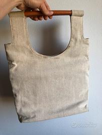 tessuto corda, manici in legno rivestiti in pelle, inserti in pelle, fodera interna in raso viola