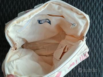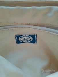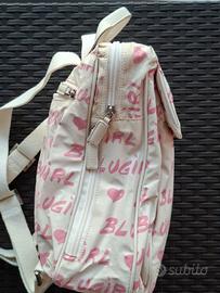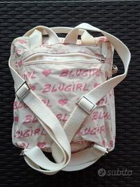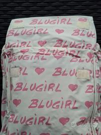 Borsa donna a zainetto vintage. Pezzo da collezione. Marca: Blugirl. Colore: bianca con scritte Blugirl i rosa. Taccone sul davanti con patta richiudibile con due velcri. Taschina laterale con chiusura a a cerniera zip. Chiusura superiore a cerniera zip. Tracolle bianche regolabili con dettagli metallici cromati. All'interno spazio capiente con taschino aperto e tasca più grande interna con chiusura a cerniera zip. Presenta segni di usura sulla fodera interna e all'esterno sono presenti delle crepe e screpolature del rivestimento.