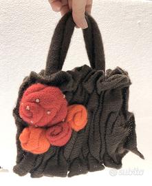 Borsa Vintage KONTESSA in maglia con lavorazione a mano. E' lavorata con motivi di pieghe e rose in nuances arancio e bordeaux molto carine in maglieria con ricamo a mano con strass cristallo. E' nuova mai usata.Manici in maglieria. E' una piccola borsa gioiello introvabile!! vedi misure e dettagli nelle immagini.