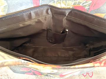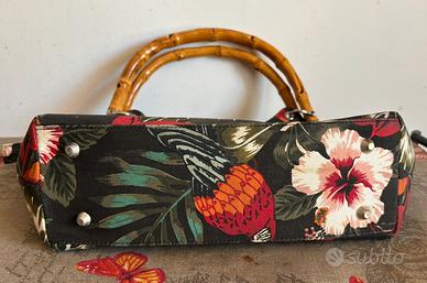 Borsa a mano anni ‘80/‘90, con manici ad arco in bambù e decorazioni in stile Bobo-chic. Sulla tela nera spiccano un pappagallo e fiori di Hibiscus ricamati con paillettes e perline. La borsa è foderata e presenta all’ interno un taschino e una tasca con zip. Il fondo rigido ha 4 piedini in metallo. Dimensioni: Larghezza 40 cm, altezza (con manici) 39 cm e profondità 10 cm.