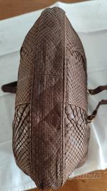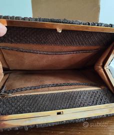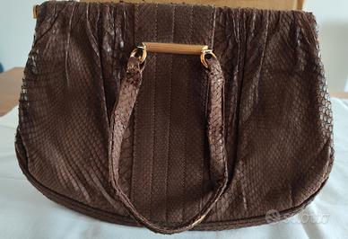bellissima borsa di pelle di serpente morbida come camoscio, marrone scuro con chiusura a scatto, vintage di famiglia ,misure larghezza 30, altezza 20. all'interno un solo scomparto con alcune taschine. manici un po' consumati, i resto ottimo.