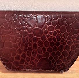 Borsa clutch vintage Enrico Coveri in colore marrone scuro, con lavorazione effetto cocco e chiusura frontale con logo. Vera pelle.