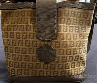 Vendo borsa Fendi a tracolla/secchiello dal fascino vintage, caratterizzata dall'iconico monogramma "FF" (Zucca/Zucchino) su tutta la superficie.