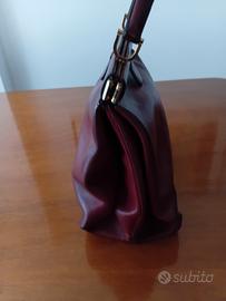Borsa a mano Gherardini modello 12 12, anni '60 in pelle bordeaux con soffietti in metallo dorato. Forma leggermente trapezioidale.