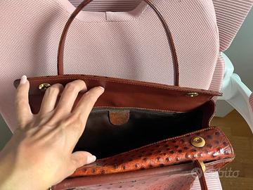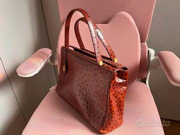 Vendo una borsa vintage I Santi in pelle di struzzo color cognac. É una borsa a mano con struttura rigida, le dimensioni sono 32x20x10 ed é in ottime condizioni.