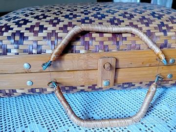 borsa in paglia e bambù, vintage, foderata artigianalmente. H 10 cm.lunga da 36 a 42 cm.larga 30 cm.