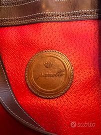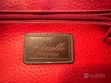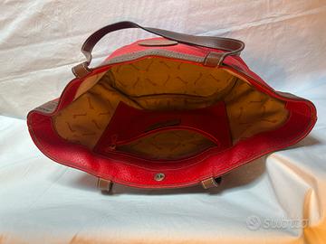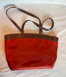 Borsa vintage in pelle rossa di Granello. Due lunghi manici in pelle marrone, interno in tessuto. Tasca in pelle rossa con cerniera. Cm 46x26x12